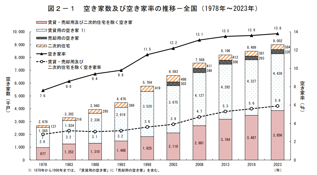 総務省の「令和5年住宅・土地統計調査」(2024年公表)によると、全国の空き家数は約900万戸に達し、空き家率は13.8%と過去最高を更新しました。